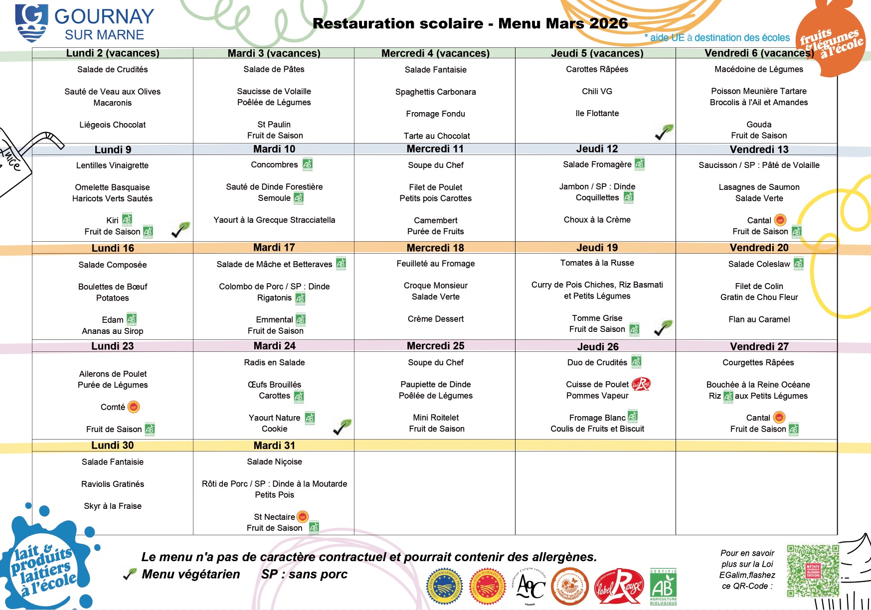 Pour les enfants souffrant d'allergies alimentaires: la famille, l'Education nationale et la commune doivent établir un Projet d'Accueil Personnalisé (P.A.I).