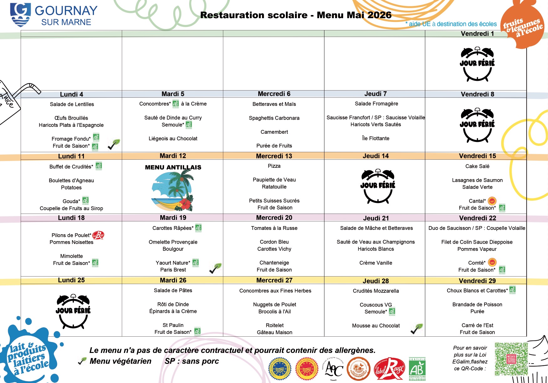 - Tarif Restauration scolaire pour les Gournaysiens : de 2,88 € à 5,14 € en fonction du Quotient Familial.