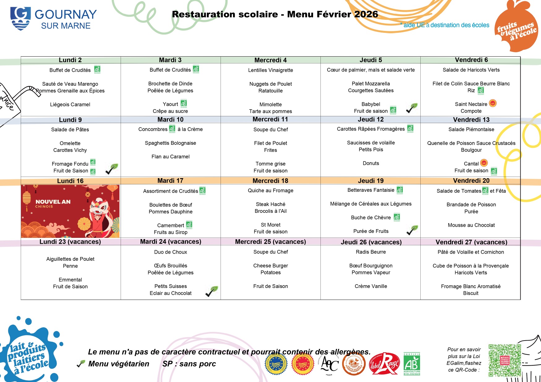 - Tarif Restauration scolaire pour les Gournaysiens : de 2,88 € à 5,14 € en fonction du Quotient Familial.