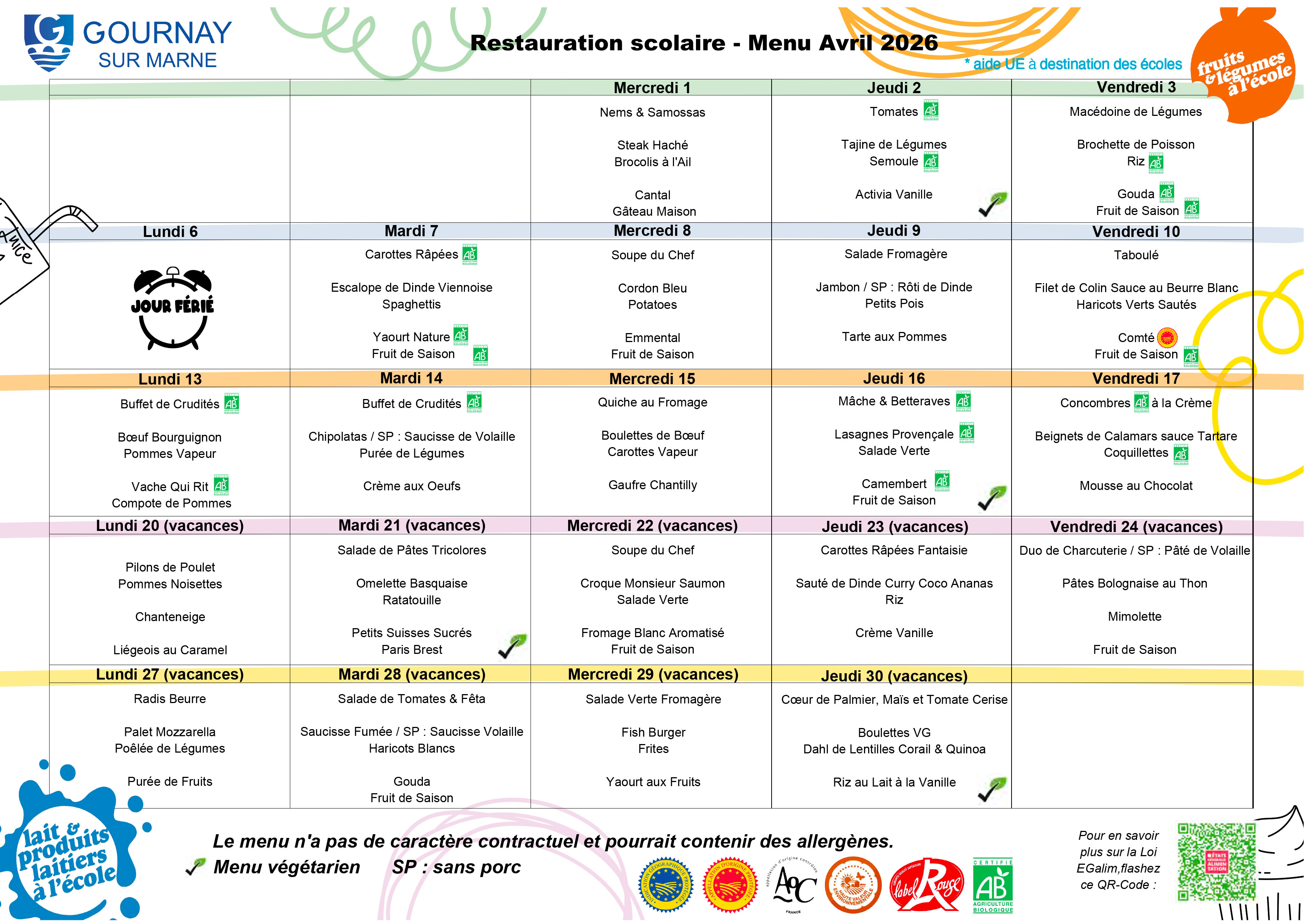 - Tarif Restauration scolaire pour les Gournaysiens : de 2,88 € à 5,14 € en fonction du Quotient Familial.