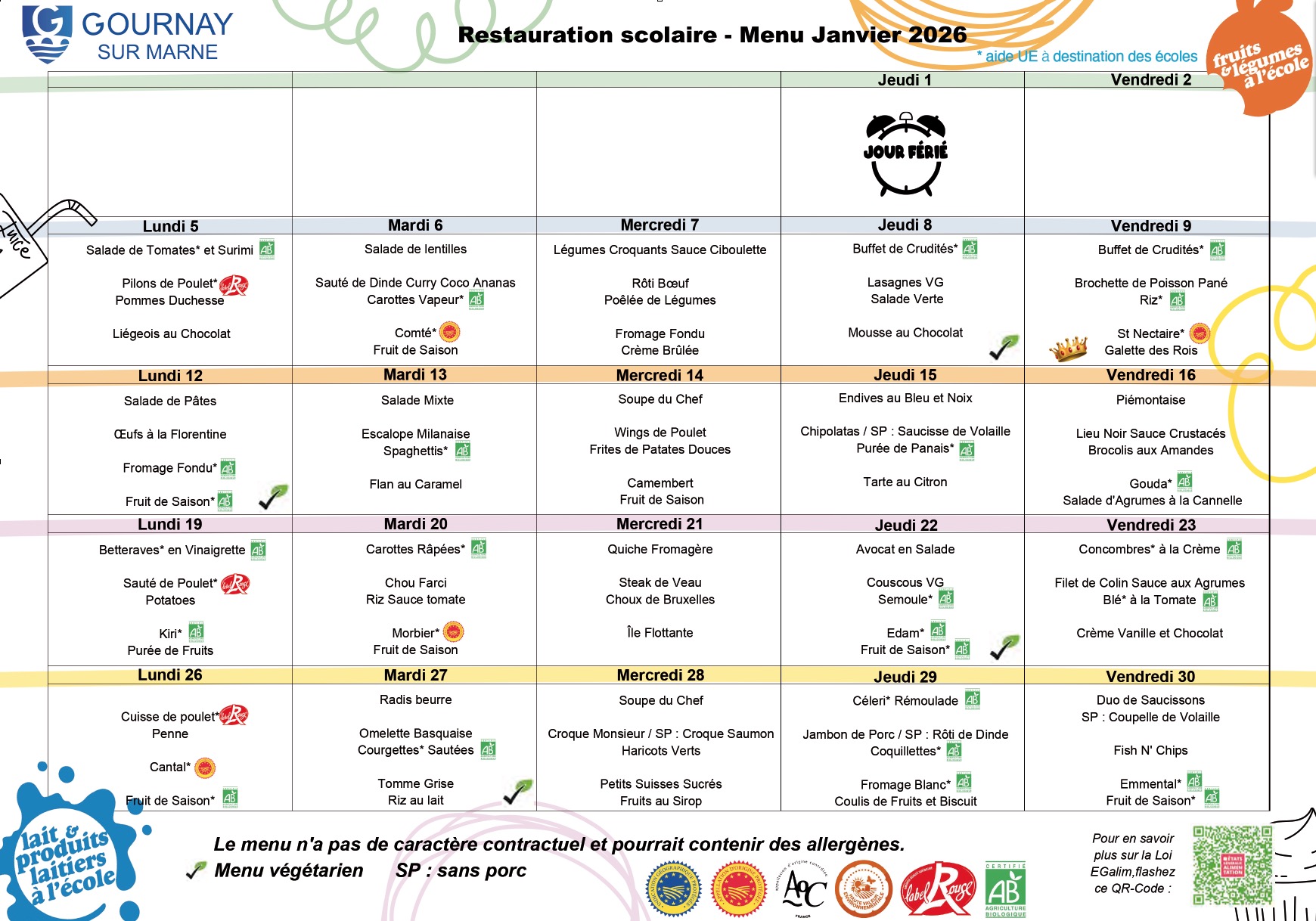 - Tarif Restauration scolaire pour les Gournaysiens : de 2,88 € à 5,14 € en fonction du Quotient Familial.